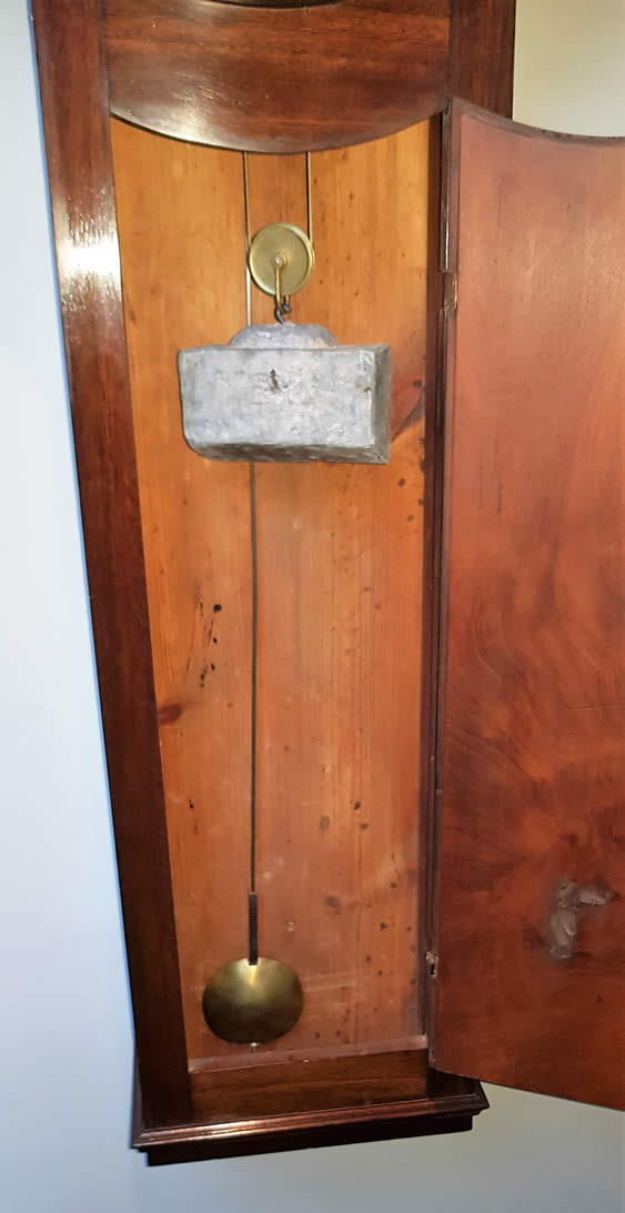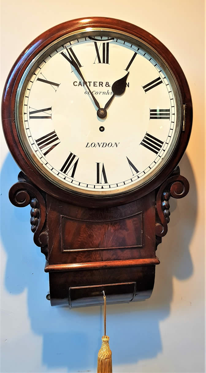 Very good colour and figuring with 8 day fusee movement, with painted dial, spade hands and signed CARTER & SON, CORNHILL, LONDON. Listed in Loomes 1810. Painted 12" dial & Roman numerals. This clock has an extremely baffling feature, at 12 o'clock on the dial is a cut-out and on the other side is a little shelf area. No idea what it is for. Intriguing as the clock has nothing missing but this embellishment has been there from day one!