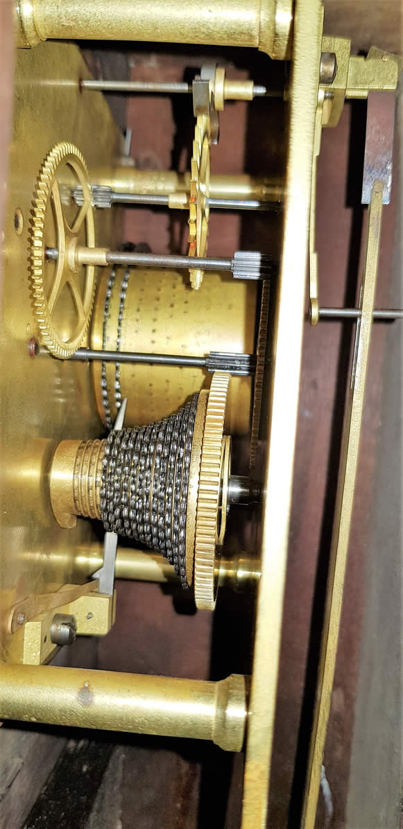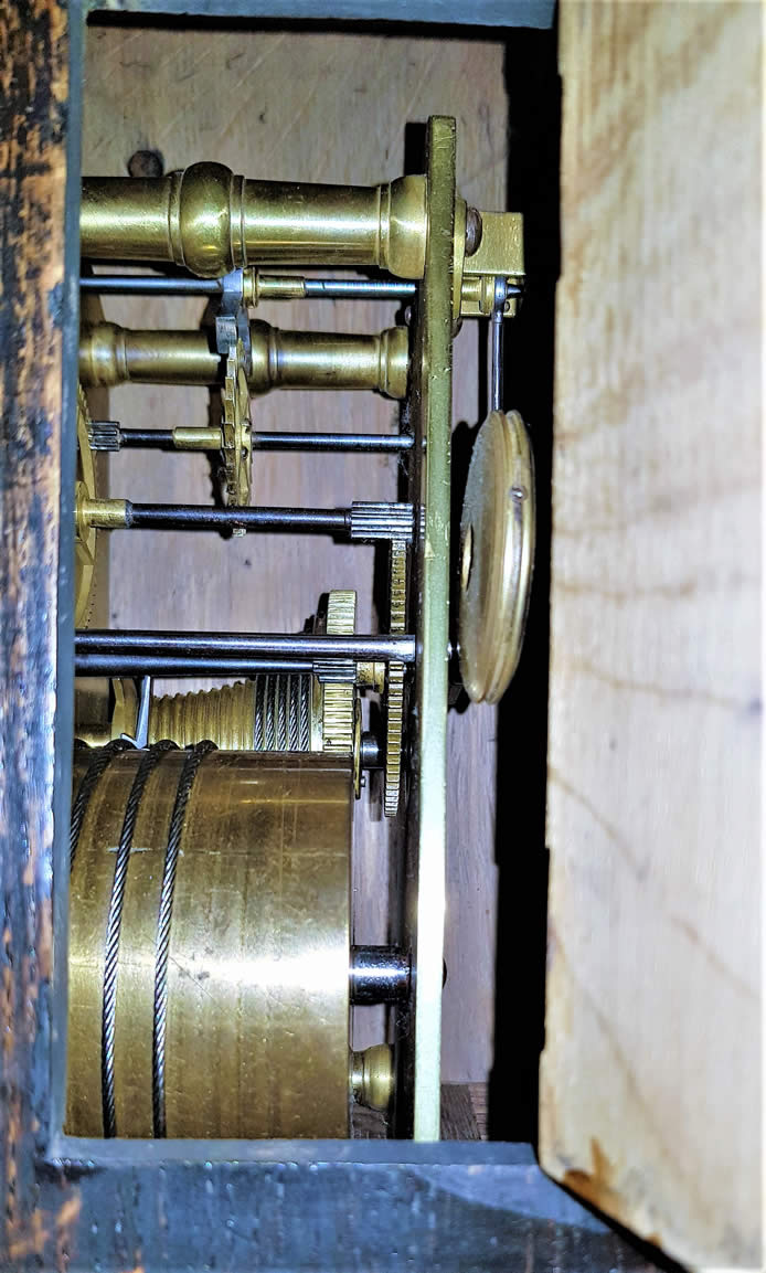 William Jones was supplied with 3 clocks from Thwaites and the number 1079 & 17 over the click wheel suggests a date according to Thwaites records of 1782. We would expect the finished clock to date later - about 1800. The back plate shape, pillars shape and pendulum rod shape all comply with Thwaites' style. The nuber, position of the number are correct for Thwaites and the fact that the number is repeated on the barrel cap.