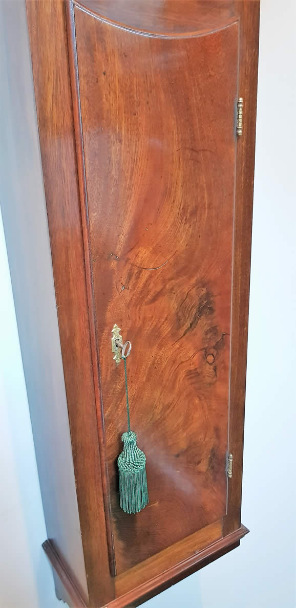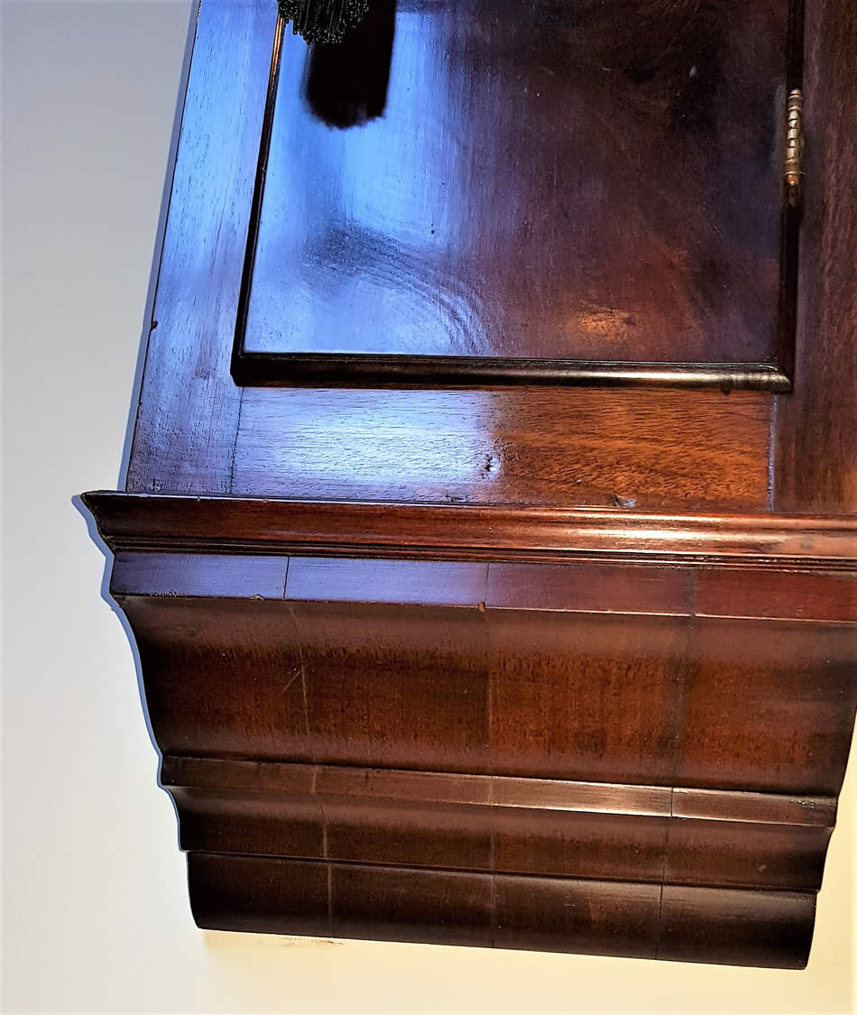 The round moulded mahogany bezel enclosing wooden dial with Roman numerals and extremely fine brass hands, the minute hand counterbalanced. Good quality flame mahogany trunk door over ogee chisel foot.