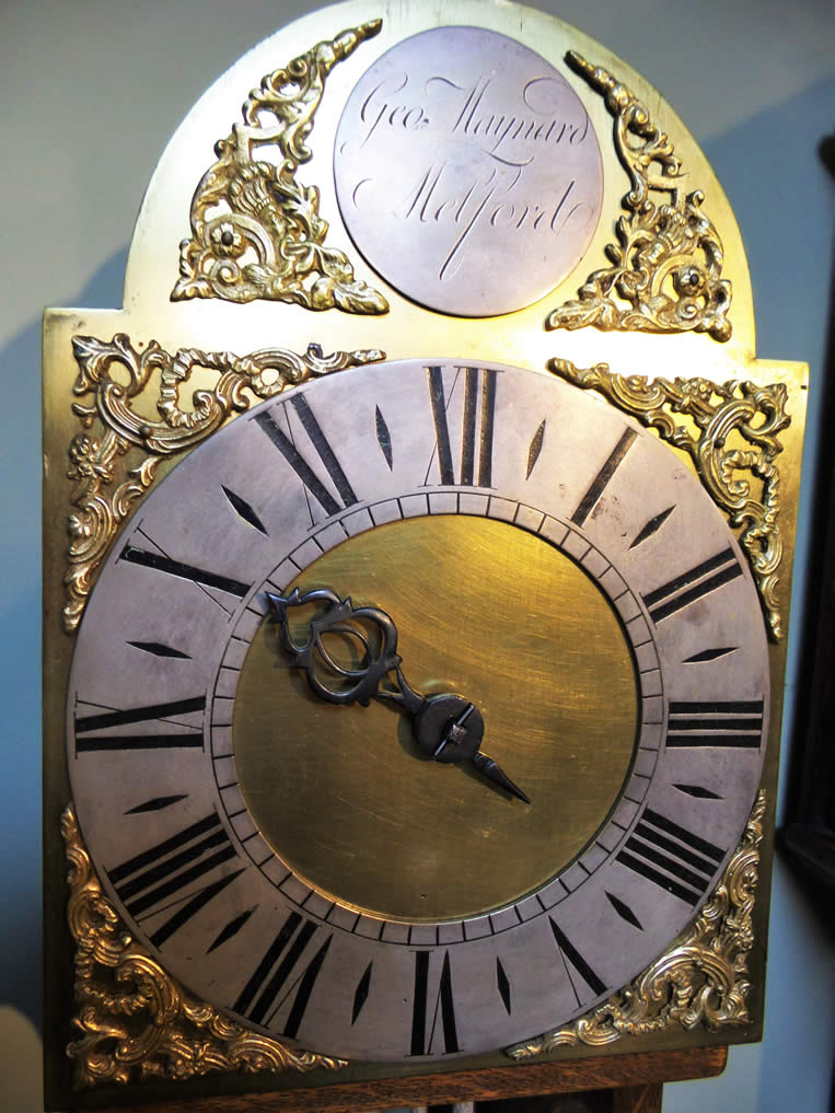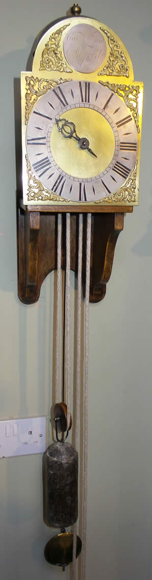 Charming 30 hours Lantern Clock with arched dial, by George Maynard, Melford on later oak bracket.