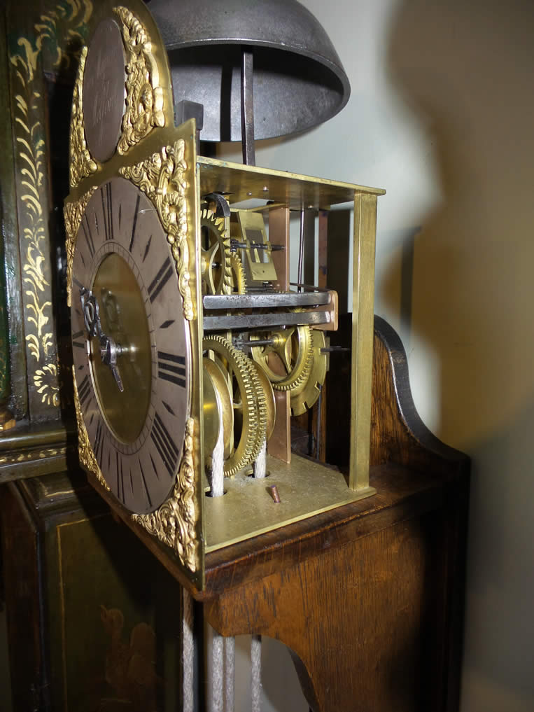 The posted movement with outside count wheel, strikng the hours on a bell.